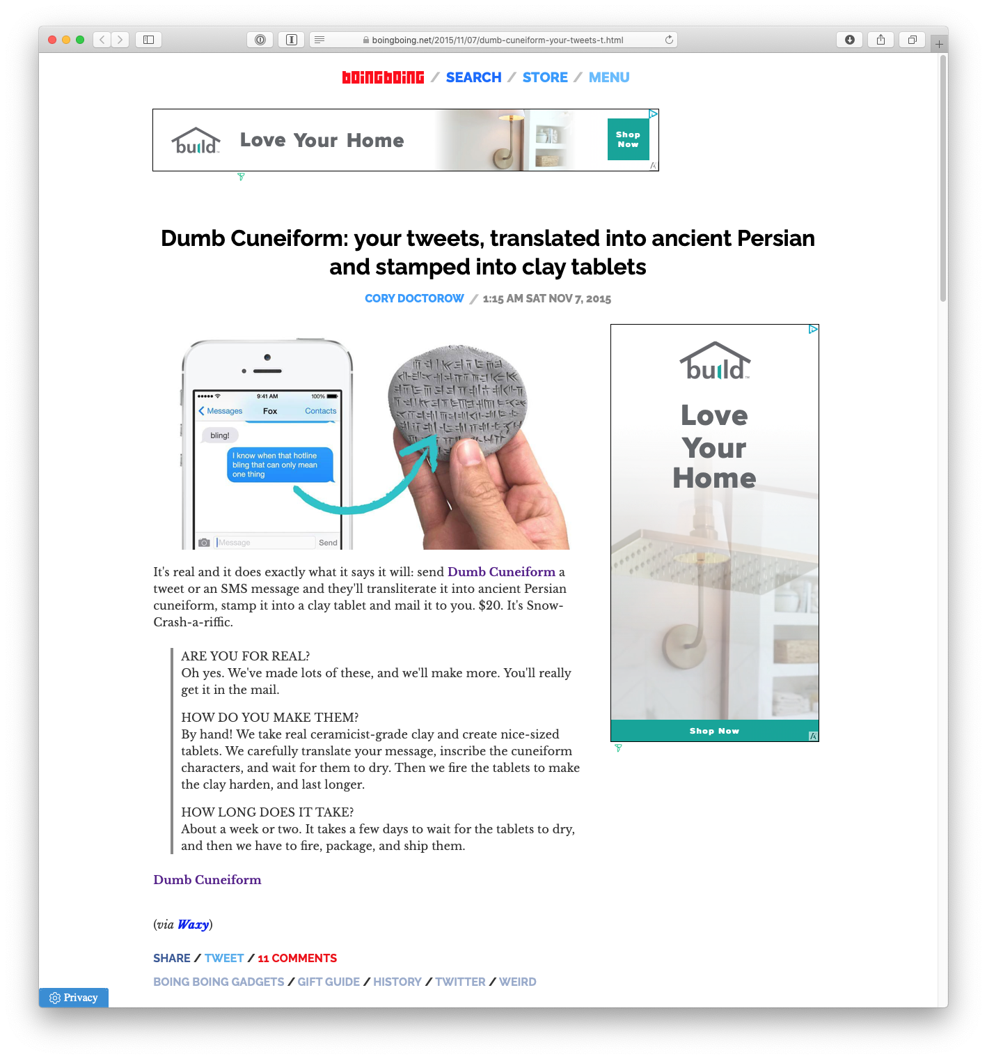 | Boing Boing | 11/07/2015 | Dumb Cuneiform: your tweets, translated into ancient Persian and stamped into clay tablets | archived |