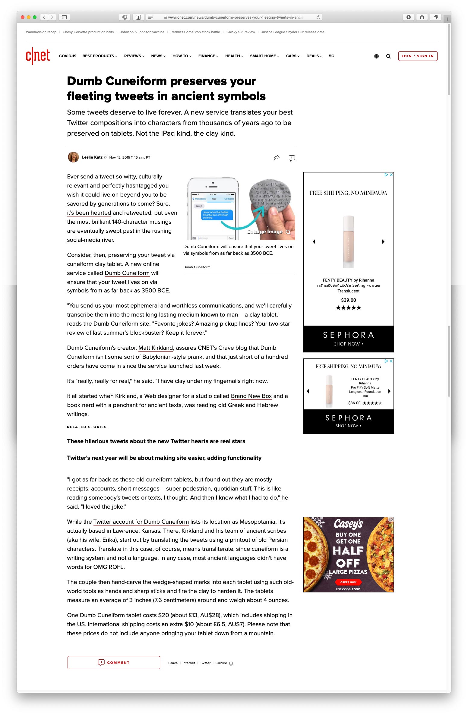 | C|net | 11/12/2015 | Dumb Cuneiform preserves your fleeting tweets in ancient symbols | archived |